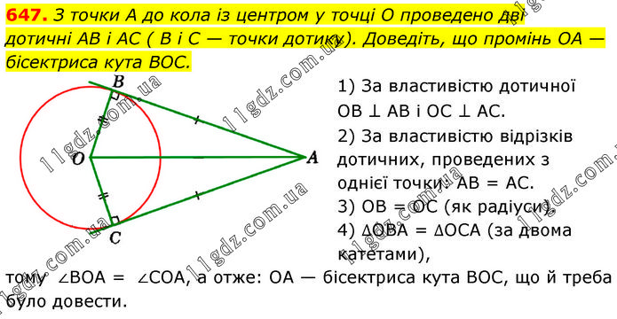 З точки А до кола із центром у точці O проведено дві дотичні AB і AC (B i C — точки дотику). Доведіть, що промінь OA — бісектриса кута BOC. 1) За властивістю дотичної OB ⊥ AB і OC ⊥ AC. 2) За властивістю відрізків дотичних, проведених з однієї точки: AB = АС. 3) OB = OC (як радіуси). 4) ∆OBA = ∆OCA (за двома катетами), тому ∠BOA = ∠COA, а отже: OA — бісектриса кута BOC, що й треба було довести.