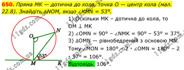 Пряма MK — дотична до кола, точка O — центр кола (мал. 22.8). Знайдіть ∠NOM, якщо ∠KMN = 53°. 1) Оскільки MK – дотична до кола, то OM ⊥ MK 2) ∠OMN = 90° – ∠NMK = 90° – 53° = 37°. 3) ∆OMN — рівнобедрений з основою MN. Тому ∠MON = 180° – 2 ∙ ∠OMN = 180° – 2 ∙ 37° = 106°. Відповідь. 106°.