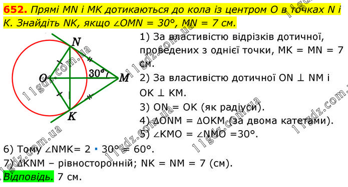 Прямі MN і MK дотикаються до кола із центром O в точках N і К. Знайдіть NK, якщо ∠OMN = 30°, MN = 7 см. 1) За властивістю відрізків дотичної, проведених з однієї точки, MK = MN = 7 см. 2) За властивістю дотичної ON ⊥ NM і OK ⊥ KM. 3) ON = OK (як радіуси). 4) ∆ONM = ∆OKM (за двома катетами). 5) ∠KMO = ∠NMO =30°. 6) Тому ∠NMK= 2 ∙ 30° = 60°. 7) ∆KNM – рівносторонній; NK = NM = 7 (см). Відповідь. 7 см.