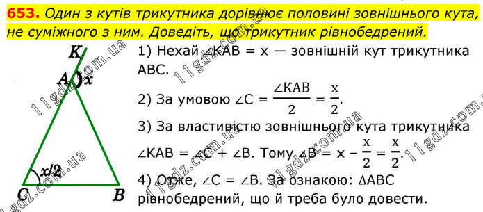 Один з кутів трикутника дорівнює половині зовнішнього кута, не суміжного з ним. Доведіть, що трикутник рівнобедрений. 1) Нехай ∠KAB = х — зовнішній кут трикутника ABC. 2) За умовою ∠C = (∠КАВ)/2 = х/2. 3) За властивістю зовнішнього кута трикутника ∠KAB = ∠C + ∠B. Тому ∠B = х – х/2 = х/2. 4) Отже, ∠C = ∠B. За ознакою: ∆ABC рівнобедрений, що й треба було довести.