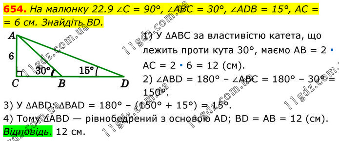 На малюнку 22.9 ∠C = 90°, ∠ABC = 30°, ∠ADB = 15°, AC = 6 см. Знайдіть BD. 1) У ∆ABC за властивістю катета, що лежить проти кута 30°, маємо AB = 2 ∙ AC = 2 ∙ 6 = 12 (см). 2) ∠ABD = 180° – ∠ABC = 180° – 30° = 150°. 3) У ∆ABD: ∆BAD = 180° – (150° + 15°) = 15°. 4) Тому ∆ABD — рівнобедрений з основою AD; BD = AB = 12 (см). Відповідь. 12 см.