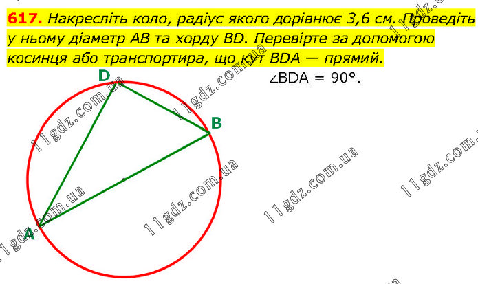 Накресліть коло, радіус якого дорівнює 3,6 см. Проведіть у ньому діаметр AB та хорду BD. Перевірте за допомогою косинця або транспортира, що кут BDA — прямий. ∠BDA = 90°.