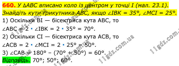 У ∆ABC вписано коло із центром у точці І (мал. 23.1). Знайдіть кути трикутника ABC, якщо ∠IBK = 35°, ∠MCI = 25°. 1) Оскільки BI — бісектриса кута ABC, то ∠ABC = 2 ∙ ∠IBK = 2 ∙ 35° = 70°. 2) Оскільки CI — бісектриса кута ACB, то ∠ACB = 2 ∙ ∠MCI = 2 ∙ 25° = 50°. 3) ∠CAB = 180° – (70° + 50°) = 60°. Відповідь. 70°; 50°; 60°.