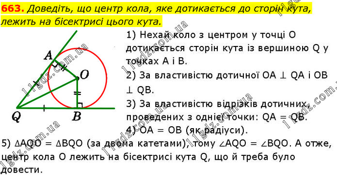 Доведіть, що центр кола, яке дотикається до сторін кута, лежить на бісектрисі цього кута. 1) Нехай коло з центром у точці O дотикається сторін кута із вершиною Q у точках A і B. 2) За властивістю дотичної OA ⊥ QA і OB ⊥ QB. 3) За властивістю відрізків дотичних, проведених з однієї точки: QA = QB. 4) OA = OB (як радіуси). 5) ∆AQO = ∆BQO (за двома катетами), тому ∠AQO = ∠BQO. А отже, центр кола O лежить на бісектрисі кута Q, що й треба було довести.