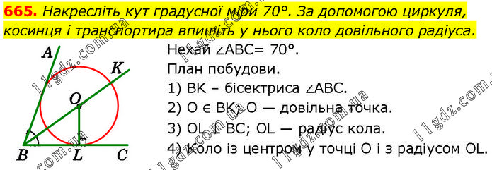 Накресліть кут градусної міри 70°. За допомогою циркуля, косинця і транспортира впишіть у нього коло довільного радіуса. Нехай ∠ABC= 70°. План побудови. 1) BK – бісектриса ∠ABC. 2) O ∈ BK; O — довільна точка. 3) OL ⊥ BC; OL — радіус кола. 4) Коло із центром у точці O і з радіусом OL.