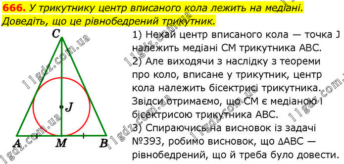 У трикутнику центр вписаного кола лежить на медіані. Доведіть, що це рівнобедрений трикутник. 1) Нехай центр вписаного кола — точка J належить медіані CM трикутника ABC. 2) Але виходячи з наслідку з теореми про коло, вписане у трикутник, центр кола належить бісектрисі трикутника. Звідси отримаємо, що CM є медіаною і бісектрисою трикутника ABC. 3) Спираючись на висновок із задачі №393, робимо висновок, що ∆ABC — рівнобедрений, що й треба було довести.