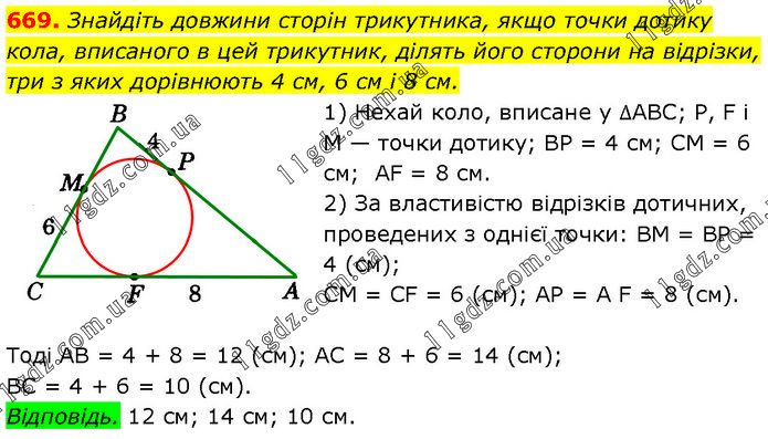 Знайдіть довжини сторін трикутника, якщо точки дотику кола, вписаного в цей трикутник, ділять його сторони на відрізки, три з яких дорівнюють 4 см, 6 см і 8 см. 1) Нехай коло, вписане у ∆ABC; Р, F і M — точки дотику; BP = 4 см; CM = 6 см; AF = 8 см. 2) За властивістю відрізків дотичних, проведених з однієї точки: BM = BP = 4 (см); CM = CF = 6 (см); AP = AF = 8 (см). Тоді AB = 4 + 8 = 12 (см); AC = 8 + 6 = 14 (см); BC = 4 + 6 = 10 (см). Відповідь. 12 см; 14 см; 10 см.