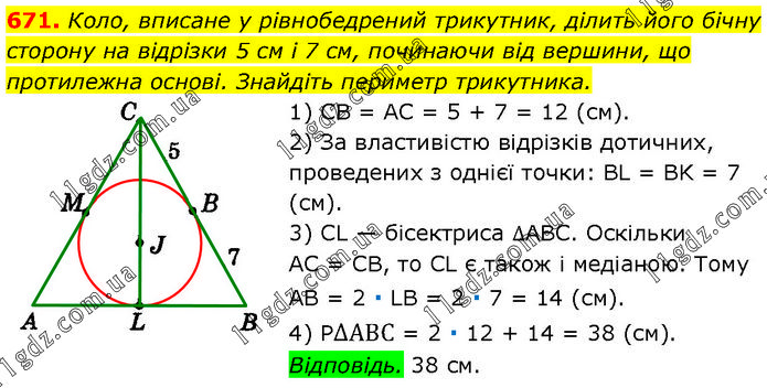 Коло, вписане у рівнобедрений трикутник, ділить його бічну сторону на відрізки 5 см і 7 см, починаючи від вершини, що протилежна основі. Знайдіть периметр трикутника. 1) CB = AC = 5 + 7 = 12 (см). 2) За властивістю відрізків дотичних, проведених з однієї точки: BL = BK = 7 (см). 3) CL — бісектриса ∆ABC. Оскільки AC = CB, то CL є також і медіаною. Тому AB = 2 ∙ LB = 2 ∙ 7 = 14 (см). 4) P∆АВС = 2 ∙ 12 + 14 = 38 (см). Відповідь. 38 см.