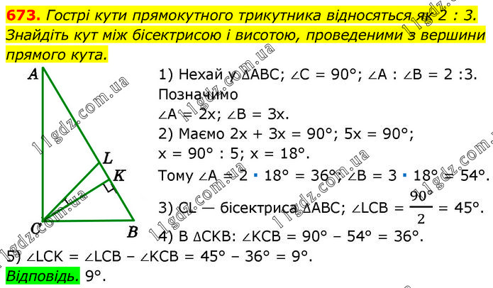 Гострі кути прямокутного трикутника відносяться як 2 : 3. Знайдіть кут між бісектрисою і висотою, проведеними з вершини прямого кута. 1) Нехай у ∆ABC; ∠C = 90°; ∠A : ∠B = 2 :3. Позначимо ∠A = 2х; ∠B = Зх. 2) Маємо 2х + Зх = 90°; 5х = 90°; х = 90° : 5; х = 18°. Тому ∠A = 2 ∙ 18° = 36°; ∠B = 3 ∙ 18° = 54°. 3) CL — бісектриса ∆ABC; ∠LCB = (90°)/2 = 45°. 4) В ∆CKB: ∠KCB = 90° – 54° = 36°. 5) ∠LCK = ∠LCB – ∠KCB = 45° – 36° = 9°. Відповідь. 9°.
