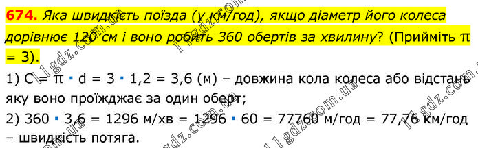 Яка швидкість поїзда (у км/год), якщо діаметр його колеса дорівнює 120 см і воно робить 360 обертів за хвилину? (Прийміть π = 3). 1) C = π ∙ d = 3 ∙ 1,2 = 3,6 (м) – довжина кола колеса або відстань яку воно проїжджає за один оберт; 2) 360 ∙ 3,6 = 1296 м/хв = 1296 ∙ 60 = 77760 м/год = 77,76 км/год – швидкість потяга.