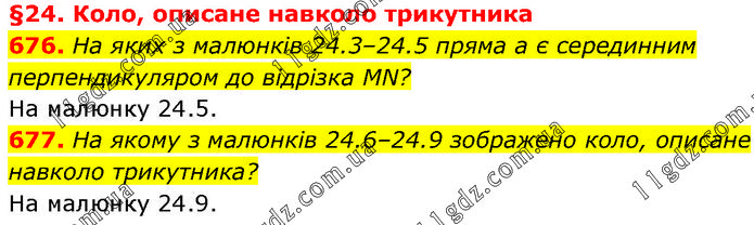 §24. Коло, описане навколо трикутника 676. На яких з малюнків 24.3–24.5 пряма а є серединним перпендикуляром до відрізка MN? На малюнку 24.5. 677. На якому з малюнків 24.6–24.9 зображено коло, описане навколо трикутника? На малюнку 24.9.