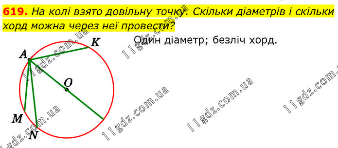 На колі взято довільну точку. Скільки діаметрів і скільки хорд можна через неї провести? Один діаметр; безліч хорд.