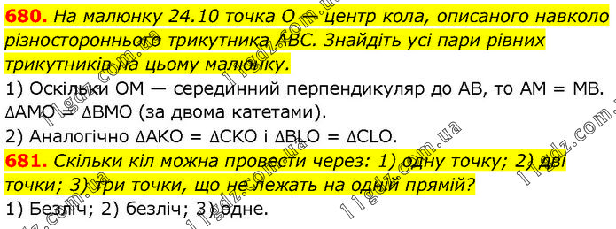 680. На малюнку 24.10 точка O — центр кола, описаного навколо різностороннього трикутника ABC. Знайдіть усі пари рівних трикутників на цьому малюнку. 1) Оскільки OM — серединний перпендикуляр до AB, то AM = MB. ∆AMO = ∆BMO (за двома катетами). 2) Аналогічно ∆AKO = ∆CKO і ∆BLO = ∆CLO. 681. Скільки кіл можна провести через: 1) одну точку; 2) дві точки; 3) три точки, що не лежать на одній прямій? 1) Безліч; 2) безліч; 3) одне.