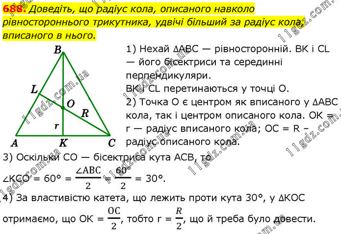 Доведіть, що радіус кола, описаного навколо рівностороннього трикутника, удвічі більший за радіус кола, вписаного в нього. 1) Нехай ∆ABC — рівносторонній. BK і CL — його бісектриси та серединні перпендикуляри. BK і CL перетинаються у точці О. 2) Точка O є центром як вписаного у ∆ABC кола, так і центром описаного кола. OK = r — радіус вписаного кола; OC = R – радіус описаного кола. 3) Оскільки CO — бісектриса кута ACB, то ∠KCO = 60° = (∠АВС)/2 = (60°)/2 = 30°. 4) За властивістю катета, що лежить проти кута 30°, у ∆КОС отримаємо, що ОК = ОС/2, тобто r = R/2, що й треба було довести.
