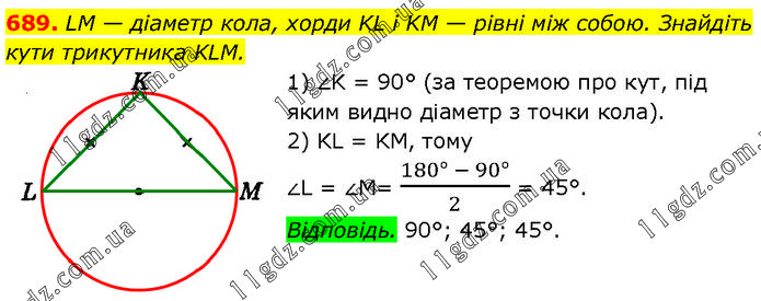 LM — діаметр кола, хорди KL і KM — рівні між собою. Знайдіть кути трикутника KLM. 1) ∠K = 90° (за теоремою про кут, під яким видно діаметр з точки кола). 2) KL = KM, тому ∠L = ∠M= (180° - 90°)/2 = 45°. Відповідь. 90°; 45°; 45°.