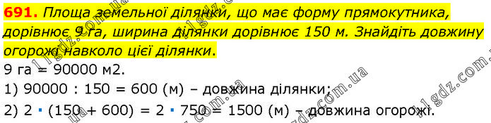 Площа земельної ділянки, що має форму прямокутника, дорівнює 9 га, ширина ділянки дорівнює 150 м. Знайдіть довжину огорожі навколо цієї ділянки. 9 га = 90000 м2. 1) 90000 : 150 = 600 (м) – довжина ділянки; 2) 2 ∙ (150 + 600) = 2 ∙ 750 = 1500 (м) – довжина огорожі.