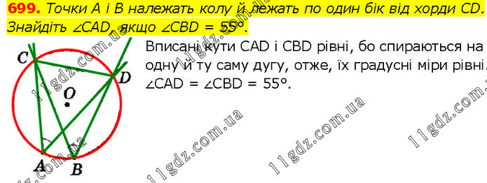 Точки A i B належать колу й лежать по один бік від хорди CD. Знайдіть ∠CAD, якщо ∠CBD = 55°. Вписані кути CAD і CBD рівні, бо спираються на одну й ту саму дугу, отже, їх градусні міри рівні. ∠CAD = ∠CBD = 55°.