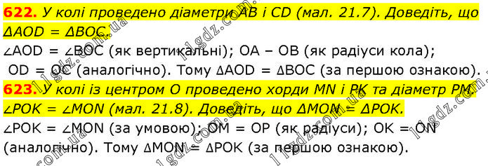 622. У колі проведено діаметри AB і CD (мал. 21.7). Доведіть, що ΔAOD = ΔBOC. ∠AOD = ∠BOC (як вертикальні); OA – OB (як радіуси кола); OD = OC (аналогічно). Тому ∆AOD = ∆BOC (за першою ознакою). 623. У колі із центром O проведено хорди MN і PK та діаметр PM. ∠POK = ∠MON (мал. 21.8). Доведіть, що ΔMON = ΔPOK. ∠POK = ∠MON (за умовою); OM = OP (як радіуси); OK = ON (аналогічно). Тому ∆MON = ∆РOK (за першою ознакою).