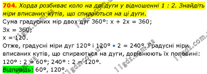 Хорда розбиває коло на дві дуги у відношенні 1 : 2. Знайдіть міри вписаних кутів, що спираються на ці дуги. Сума градусних мір двох дуг 360° : х + 2х = 360; Зх = 360; х = 120. Отже, градусні міри дуг 120° і 120° • 2 = 240°. Градусні міри вписаних кутів, що спираються на дуги, дорівнюють їх половині: 120° : 2 = 60°; 240° : 2 = 120°. Відповідь: 60°, 120°.