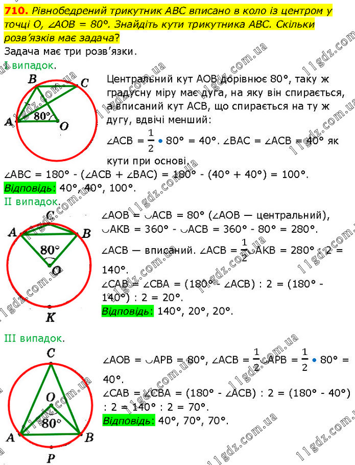 Рівнобедрений трикутник ABC вписано в коло із центром у точці О, ∠AOB = 80°. Знайдіть кути трикутника ABC. Скільки розв’язків має задача? Задача має три розв’язки. I випадок. Центральний кут АОВ дорівнює 80°, таку ж градусну міру має дуга, на яку він спирається, а вписаний кут АСВ, що спирається на ту ж дугу, вдвічі менший: ∠АСВ = 1/2 • 80° = 40°. ∠ВАС = ∠АСВ = 40° як кути при основі. ∠АВС = 180° - (∠АСВ + ∠ВАС) = 180° - (40° + 40°) = 100°. Відповідь: 40°, 40°, 100°. II випадок. ∠АОВ = ◡АСВ = 80° (∠АОВ — центральний), ◡АКВ = 360° - ◡АСВ = 360° - 80° = 280°. ∠АСВ — вписаний. ∠АСВ = 1/2◡АKВ = 280° : 2 = 140°. ∠CAB = ∠CBA = (180° - ∠АСВ) : 2 = (180° - 140°) : 2 = 20°. Відповідь: 140°, 20°, 20°. III випадок. ∠АОВ = ◡AРВ = 80°, ∠АСВ = 1/2◡АРВ = 1/2 • 80° = 40°. ∠САВ = ∠СВА = (180° - ∠АСВ) : 2 = (180° - 40°) : 2 = 140° : 2 = 70°. Відповідь: 40°, 70°, 70°.
