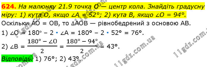 На малюнку 21.9 точка O — центр кола. Знайдіть градусну міру: 1) кута О, якщо ∠A = 52°; 2) кута В, якщо ∠O = 94°. Оскільки AO = OB, то ∆AOB — рівнобедрений з основою AB. 1) ∠O = 180° – 2 ∙ ∠A = 180° – 2 ∙ 52° = 76°. 2) ∠B = (180° - ∠О)/2 = (180° - 94°)/2 = 43°. Відповідь. 1) 76°; 2) 43°.