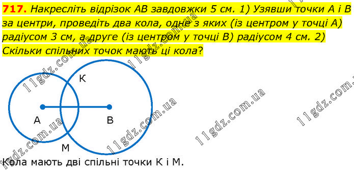 Накресліть відрізок AB завдовжки 5 см. 1) Узявши точки А і В за центри, проведіть два кола, одне з яких (із центром у точці А) радіусом 3 см, а друге (із центром у точці В) радіусом 4 см. 2) Скільки спільних точок мають ці кола? Кола мають дві спільні точки К і М.