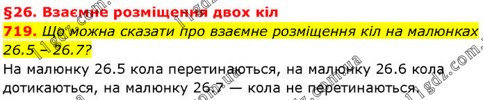 §26. Взаємне розміщення двох кіл 719. Що можна сказати про взаємне розміщення кіл на малюнках 26.5 – 26.7? На малюнку 26.5 кола перетинаються, на малюнку 26.6 кола дотикаються, на малюнку 26.7 — кола не перетинаються.