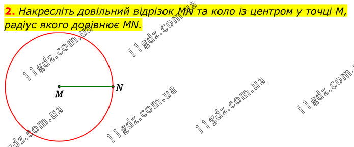 Накресліть довільний відрізок MN та коло із центром у точці М, радіус якого дорівнює MN.