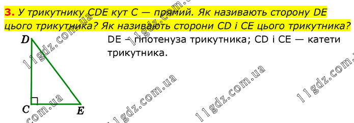 У трикутнику CDE кут C — прямий. Як називають сторону DE цього трикутника? Як називають сторони CD і CE цього трикутника? DE – гіпотенуза трикутника; CD і CE — катети трикутника.
