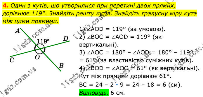 Один з кутів, що утворилися при перетині двох прямих, дорівнює 119°. Знайдіть решту кутів. Знайдіть градусну міру кута між цими прямими. 1) ∠AOD = 119° (за умовою). 2) ∠BOC = ∠AOD = 119° (як вертикальні). 3) ∠AOC = 180° – ∠AOD = 180° – 119° = 61° (за властивістю суміжних кутів). 4) ∠BOD = ∠AOC = 61° (як вертикальні). Кут між прямими дорівнює 61°. BC = 24 – 2 ∙ 9 = 24 – 18 = 6 (см). Відповідь. 6 см.