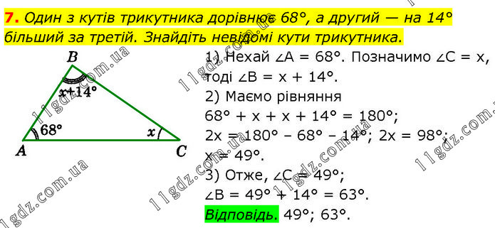 Один з кутів трикутника дорівнює 68°, а другий — на 14° більший за третій. Знайдіть невідомі кути трикутника. 1) Нехай ∠A = 68°. Позначимо ∠C = х, тоді ∠B = x + 14°. 2) Маємо рівняння 68° + х + х + 14° = 180°; 2х = 180° – 68° – 14°; 2х = 98°; х = 49°. 3) Отже, ∠C = 49°; ∠B = 49° + 14° = 63°. Відповідь. 49°; 63°.