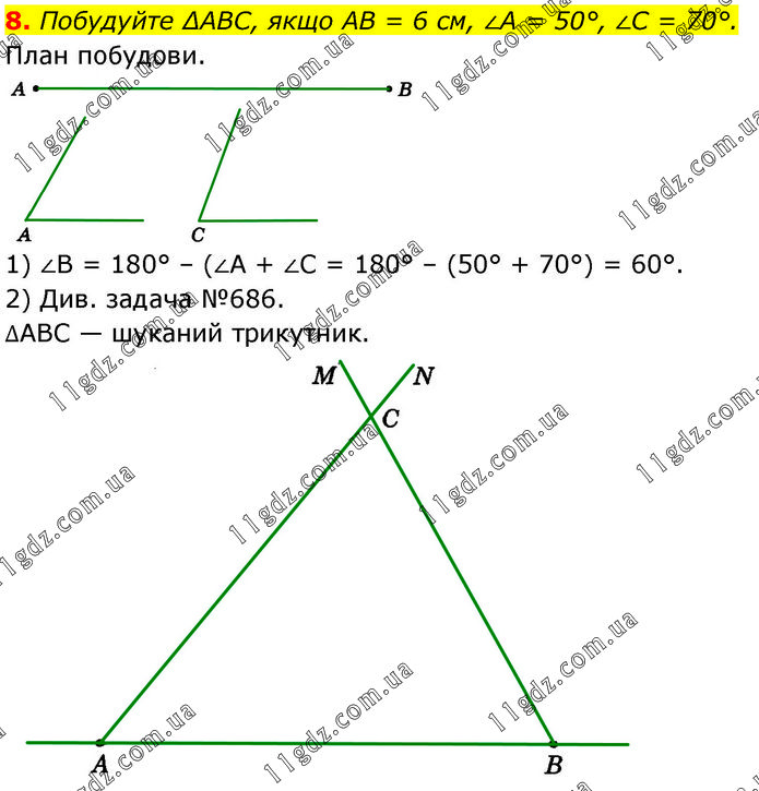 Побудуйте ΔABC, якщо AB = 6 см, ∠A = 50°, ∠C = 70°. План побудови. 1) ∠B = 180° – (∠A + ∠C = 180° – (50° + 70°) = 60°. 2) Див. задача №686. ∆ABC — шуканий трикутник.