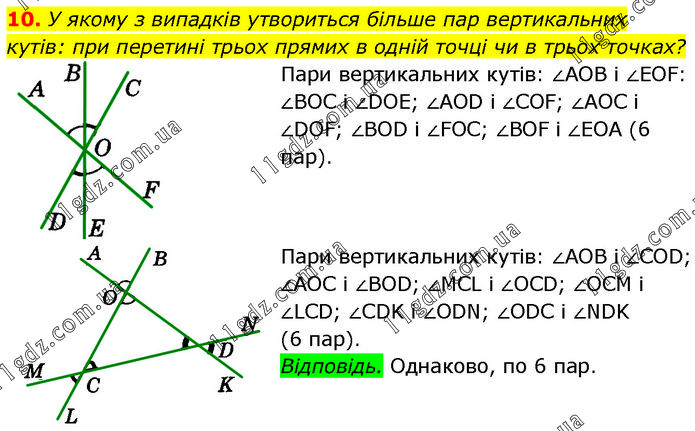 У якому з випадків утвориться більше пар вертикальних кутів: при перетині трьох прямих в одній точці чи в трьох точках? Пари вертикальних кутів: ∠AOB і ∠EOF: ∠BOC і ∠DOE; ∠AOD і ∠COF; ∠AOC і ∠DOF; ∠BOD і ∠FOC; ∠BOF і ∠EOA (6 пар). Пари вертикальних кутів: ∠AOB і ∠COD; ∠AOC і ∠BOD; ∠MCL і ∠OCD; ∠OCM і ∠LCD; ∠CDK і ∠ODN; ∠ODC і ∠NDK (6 пар). Відповідь. Однаково, по 6 пар.