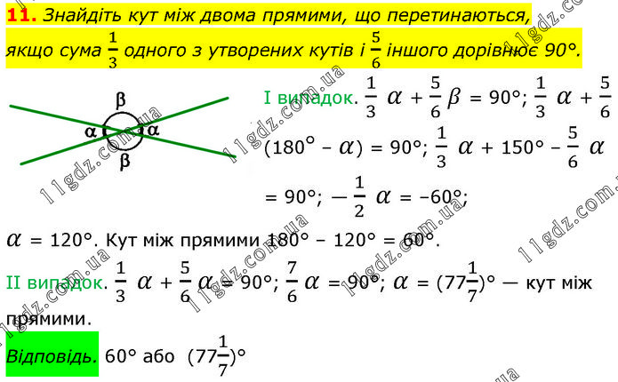 Знайдіть кут між двома прямими, що перетинаються, якщо сума 1/3 одного з утворених кутів і 5/6 іншого дорівнює 90°. I випадок. 1/3 α + 5/6 β = 90°; 1/3 α + 5/6 (180° – α) = 90°; 1/3 α + 150° – 5/6 α = 90°; — 1/2 α = –60°; α = 120°. Кут між прямими 180° – 120° = 60°. II випадок. 1/3 α + 5/6 α = 90°; 7/6 α = 90°; α = (771/7)° — кут між прямими. Відповідь. 60° або (771/7)°