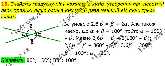 Знайдіть градусну міру кожного з кутів, утворених при перетині двох прямих, якщо один з них у 2,6 раза менший від суми трьох інших. За умовою 2,6 β = β + 2α. Але також маємо, що α + β = 180°, тобто α = 180° – β. Маємо 2,6β = β + 2(180° – β); 2,6β = β + 360° – 2β; 3,6β = 360°; β = 100°; α = 80°. Відповідь. 80°; 100°; 80°; 100°.