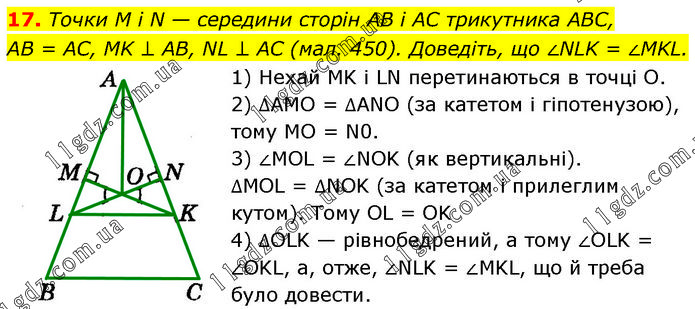 Точки M i N — середини сторін AB і AC трикутника ABC, AB = AC, MK ⊥ AB, NL ⊥ AC (мал. 450). Доведіть, що ∠NLK = ∠MKL. 1) Нехай MK і LN перетинаються в точці О. 2) ∆АМО = ∆ANO (за катетом і гіпотенузою), тому MO = N0. 3) ∠MOL = ∠NOK (як вертикальні). ∆MOL = ∆NOK (за катетом і прилеглим кутом). Тому OL = OK 4) ∆OLK — рівнобедрений, а тому ∠OLK = ∠OKL, а, отже, ∠NLK = ∠MKL, що й треба було довести.