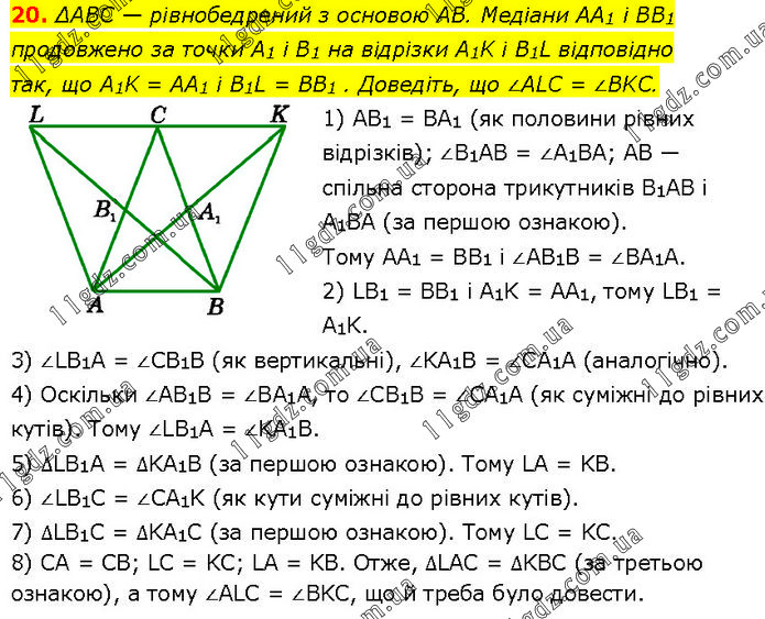 ΔABC — рівнобедрений з основою AB. Медіани AA1 і BB1 продовжено за точки A1 і B1 на відрізки A1K і B1L відповідно так, що A1K = AA1 і B1L = BB1 . Доведіть, що ∠ALC = ∠BKC. 1) AB1 = BA1 (як половини рівних відрізків); ∠B1AB = ∠A1BA; AB — спільна сторона трикутників B1AB і A1BA (за першою ознакою). Тому АA1 = ВB1 і ∠AB1B = ∠BA1A. 2) LB1 = BB1 і A1K = AA1, тому LB1 = A1K. 3) ∠LB1A = ∠CB1B (як вертикальні), ∠KA1B = ∠CA1A (аналогічно). 4) Оскільки ∠AB1B = ∠BA1A, то ∠CB1B = ∠CA1A (як суміжні до рівних кутів). Тому ∠LB1A = ∠KA1B. 5) ∆LB1A = ∆KA1B (за першою ознакою). Тому LA = KB. 6) ∠LB1C = ∠CA1K (як кути суміжні до рівних кутів). 7) ∆LB1C = ∆KA1C (за першою ознакою). Тому LC = KC. 8) CA = CB; LC = KC; LA = KB. Отже, ∆LAC = ∆KBC (за третьою ознакою), а тому ∠ALC = ∠BKC, що й треба було довести.
