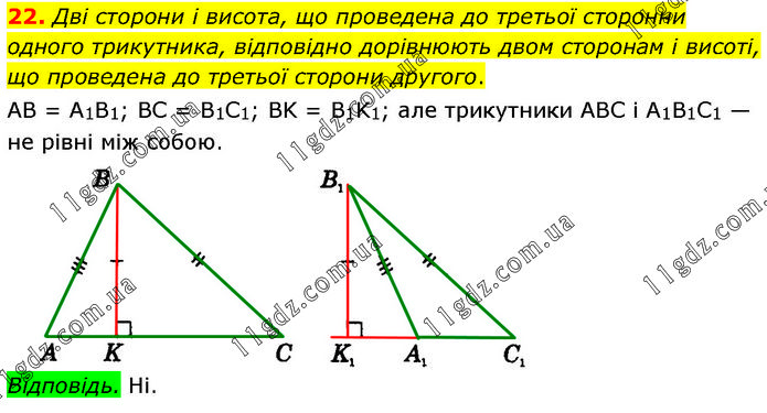 Дві сторони і висота, що проведена до третьої сторони одного трикутника, відповідно дорівнюють двом сторонам і висоті, що проведена до третьої сторони другого. AB = A1B1; BC = B1C1; BK = B1K1; але трикутники ABC і A1B1C1 — не рівні між собою. Відповідь. Ні.