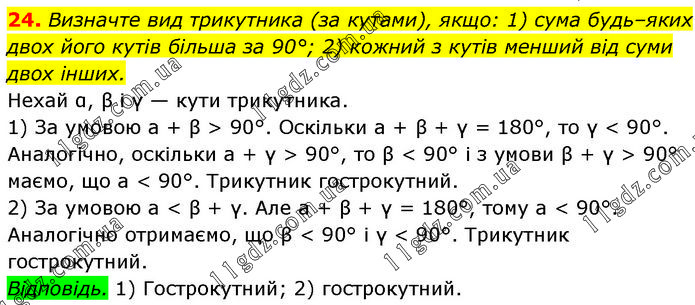 Визначте вид трикутника (за кутами), якщо: 1) сума будь–яких двох його кутів більша за 90°; 2) кожний з кутів менший від суми двох інших. Нехай α, β і γ — кути трикутника. 1) За умовою а + β > 90°. Оскільки а + β + γ = 180°, то γ < 90°. Аналогічно, оскільки а + γ > 90°, то β < 90° і з умови β + γ > 90° маємо, що а < 90°. Трикутник гострокутний. 2) За умовою а < β + γ. Але а + β + γ = 180°, тому а < 90°. Аналогічно отримаємо, що β < 90° і γ < 90°. Трикутник гострокутний. Відповідь. 1) Гострокутний; 2) гострокутний.