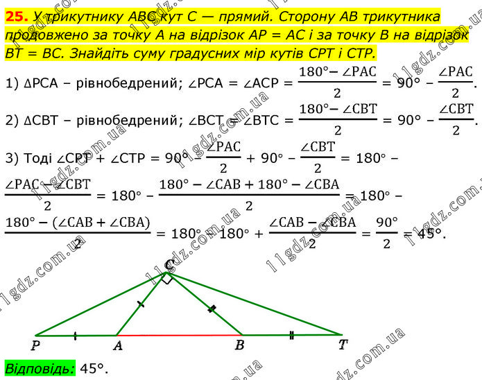 У трикутнику ABC кут C — прямий. Сторону AB трикутника продовжено за точку А на відрізок AP = AC і за точку В на відрізок BT = BC. Знайдіть суму градусних мір кутів CPT і CTP. 1) ∆РСА – рівнобедрений; ∠РСА = ∠АСР = (180°- ∠РАС)/2 = 90° – (∠РАС)/2. 2) ∆СВТ – рівнобедрений; ∠ВСТ = ∠ВТС = (180°- ∠СВТ)/2 = 90° – (∠СВТ)/2. 3) Тоді ∠СРТ + ∠СТР = 90° – (∠РАС)/2 + 90° – (∠СВТ)/2 = 180° – (∠РАС - ∠СВТ)/2 = 180° – (180° - ∠САВ + 180° - ∠СВА)/2 = 180° – (180° - (∠САВ + ∠СВА))/2 = 180° – 180° + (∠САВ - ∠СВА)/2 = (90°)/2 = 45°.