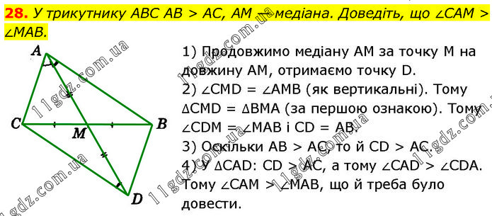 У трикутнику ABC AB > AC, AM — медіана. Доведіть, що ∠САМ > ∠МАВ. 1) Продовжимо медіану AM за точку M на довжину AM, отримаємо точку D. 2) ∠CMD = ∠AMB (як вертикальні). Тому ∆CMD = ∆BMA (за першою ознакою). Тому ∠CDM = ∠MAB i CD = AB. 3) Оскільки AB > АС, то й CD > АС. 4) У ∆CAD: CD > АС, а тому ∠CAD > ∠CDA. Тому ∠CAM > ∠MAB, що й треба було довести.