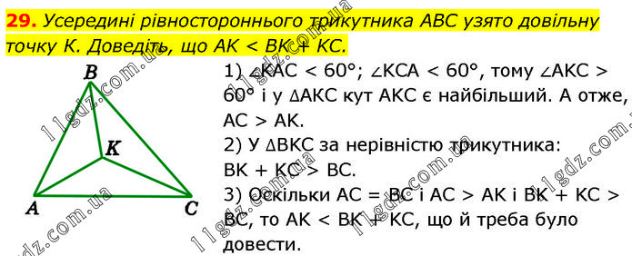 Усередині рівностороннього трикутника ABC узято довільну точку К. Доведіть, що AK < BK + KC. 1) ∠KAC < 60°; ∠KCA < 60°, тому ∠AKC > 60° і у ∆AКC кут AKC є найбільший. А отже, AC > AK. 2) У ∆BKC за нерівністю трикутника: BK + KC > BC. 3) Оскільки AC = BC і AC > AK і BK + KC > BC, то AK < BK + KC, що й треба було довести.