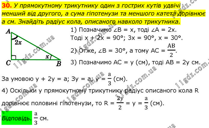 У прямокутному трикутнику один з гострих кутів удвічі менший від другого, а сума гіпотенузи та меншого катета дорівнює а см. Знайдіть радіус кола, описаного навколо трикутника. 1) Позначимо ∠B = х, тоді ∠A = 2х. Тоді х + 2х = 90°; 3x = 90°, x = 30°. 2) Отже, ∠B = 30°, а тому AC = АВ/2. 3) Позначимо AC = у (см), тоді AB = 2у см. За умовою у + 2у = а; Зу = а; у = а/3 (см). 4) Оскільки у прямокутному трикутнику радіус описаного кола R дорівнює половині гіпотенузи, то R = 2у/2 = у = а/3 (см). Відповідь. а/3 см.
