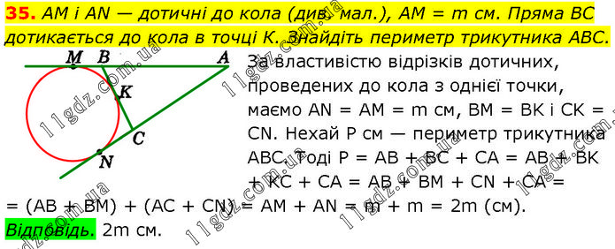 AM і AN — дотичні до кола (див. мал.), AM = m см. Пряма BC дотикається до кола в точці К. Знайдіть периметр трикутника ABC. За властивістю відрізків дотичних, проведених до кола з однієї точки, маємо AN = AM = m cм, BM = BK і CK = CN. Нехай P см — периметр трикутника ABC. Тоді P = AB + BC + CA = AB + BK + KC + CA = AB + BM + CN + CA = = (AB + BM) + (АС + CN) = AM + AN = m + m = 2m (см). Відповідь. 2m см.