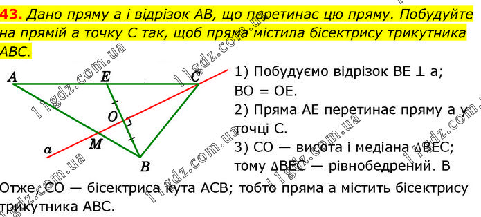 Дано пряму а і відрізок AB, що перетинає цю пряму. Побудуйте на прямій а точку C так, щоб пряма містила бісектрису трикутника ABC. 1) Побудуємо відрізок BE ⊥ а; BO = OE. 2) Пряма AE перетинає пряму а у точці С. 3) CO — висота і медіана ∆BEC; тому ∆BEC — рівнобедрений. В Отже, CO — бісектриса кута ACB; тобто пряма а містить бісектрису трикутника ABC.