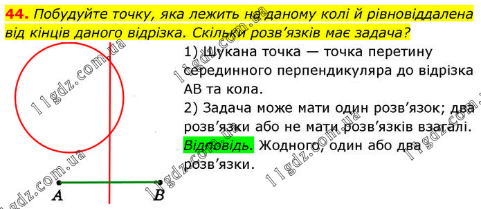 Побудуйте точку, яка лежить на даному колі й рівновіддалена від кінців даного відрізка. Скільки розв’язків має задача? 1) Шукана точка — точка перетину серединного перпендикуляра до відрізка AB та кола. 2) Задача може мати один розв’язок; два розв’язки або не мати розв’язків взагалі. Відповідь. Жодного, один або два розв’язки.