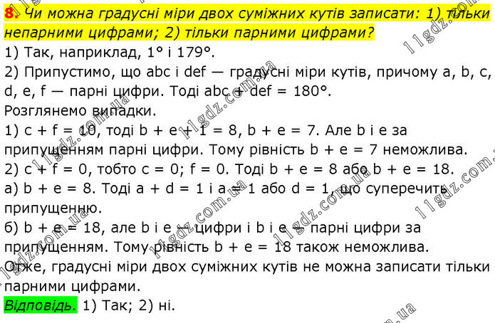 Чи можна градусні міри двох суміжних кутів записати: 1) тільки непарними цифрами; 2) тільки парними цифрами? 1) Так, наприклад, 1° і 179°. 2) Припустимо, що abc і def — градусні міри кутів, причому a, b, с, d, е, f — парні цифри. Тоді abc + def = 180°. Розглянемо випадки. 1) с + f = 10, тоді b + e + 1 = 8, b + e = 7. Але b і е за припущенням парні цифри. Тому рівність b + е = 7 неможлива. 2) с + f = 0, тобто с = 0; f = 0. Тоді b + е = 8 або b + е = 18. a) b + е = 8. Тоді a + d = 1 i a = 1 або d = 1, що суперечить припущенню. б) b + е = 18, але b і е — цифри і b і е — парні цифри за припущенням. Тому рівність b + е = 18 також неможлива. Отже, градусні міри двох суміжних кутів не можна записати тільки парними цифрами. Відповідь. 1) Так; 2) ні.