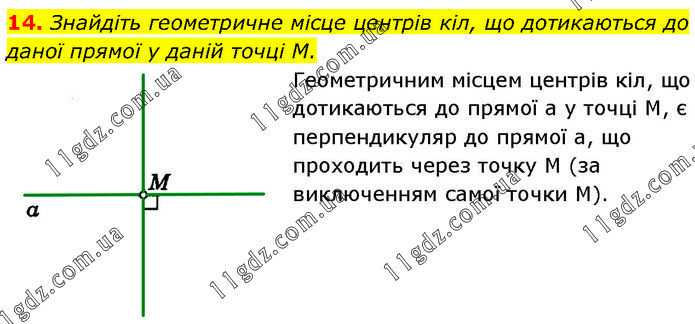 Знайдіть геометричне місце центрів кіл, що дотикаються до даної прямої у даній точці М. Геометричним місцем центрів кіл, що дотикаються до прямої а у точці М, є перпендикуляр до прямої а, що проходить через точку M (за виключенням самої точки М).