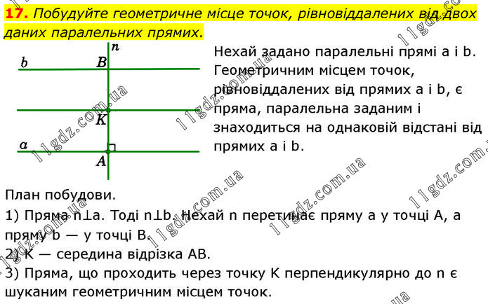 Побудуйте геометричне місце точок, рівновіддалених від двох даних паралельних прямих. Нехай задано паралельні прямі а і b. Геометричним місцем точок, рівновіддалених від прямих а і b, є пряма, паралельна заданим і знаходиться на однаковій відстані від прямих a і b. План побудови. 1) Пряма n⊥а. Тоді n⊥b. Нехай n перетинає пряму а у точці А, а пряму b — у точці В. 2) K — середина відрізка AB. 3) Пряма, що проходить через точку K перпендикулярно до n є шуканим геометричним місцем точок