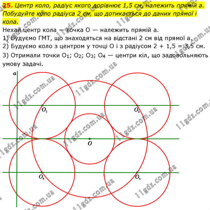 Центр коло, радіус якого дорівнює 1,5 см, належить прямій а. Побудуйте коло радіуса 2 см, що дотикається до даних прямої і кола. Нехай центр кола — точка O — належить прямій а. 1) Будуємо ГМТ, що знаходяться на відстані 2 см від прямої а. 2) Будуємо коло з центром у точці O і з радіусом 2 + 1,5 = З,5 см. 3) Отримали точки O1; O2; O3; O4 — центри кіл, що задовольняють умову задачі.